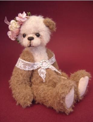 Each kit includes mohair and paw pad fabrics, joints, German glass eyes, thread for embroidering the mouth and clay for the nose. The mohair for the bear is pale pink and taupe. (Please note that stuffing and thread for sewing the bear together is not included in this kit). Included in the kit are the flowers and ribbon, lace and a brooch to dress her.